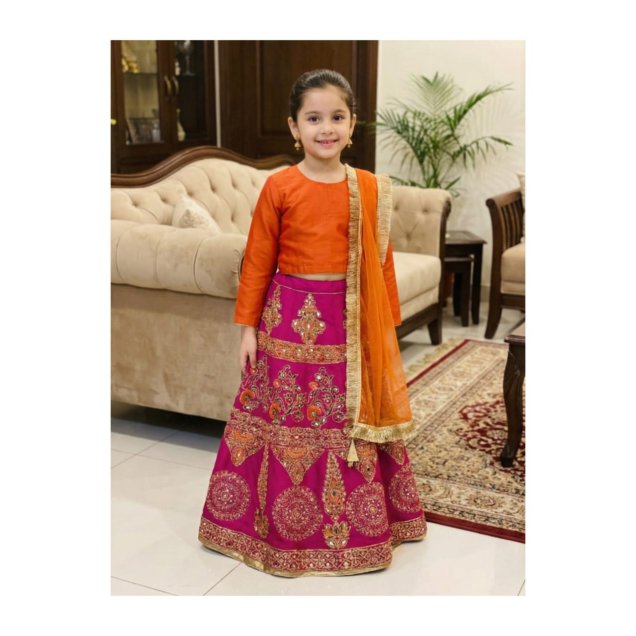 The Orange Choli adds a touch of warmth and playfulness, creating a truly show-stopping design. Our Lehanga and Choli set is designed to make your child feel confident and stylish. The high-quality fabric ensures a comfortable fit, making it perfect for kids to wear on special occasions.