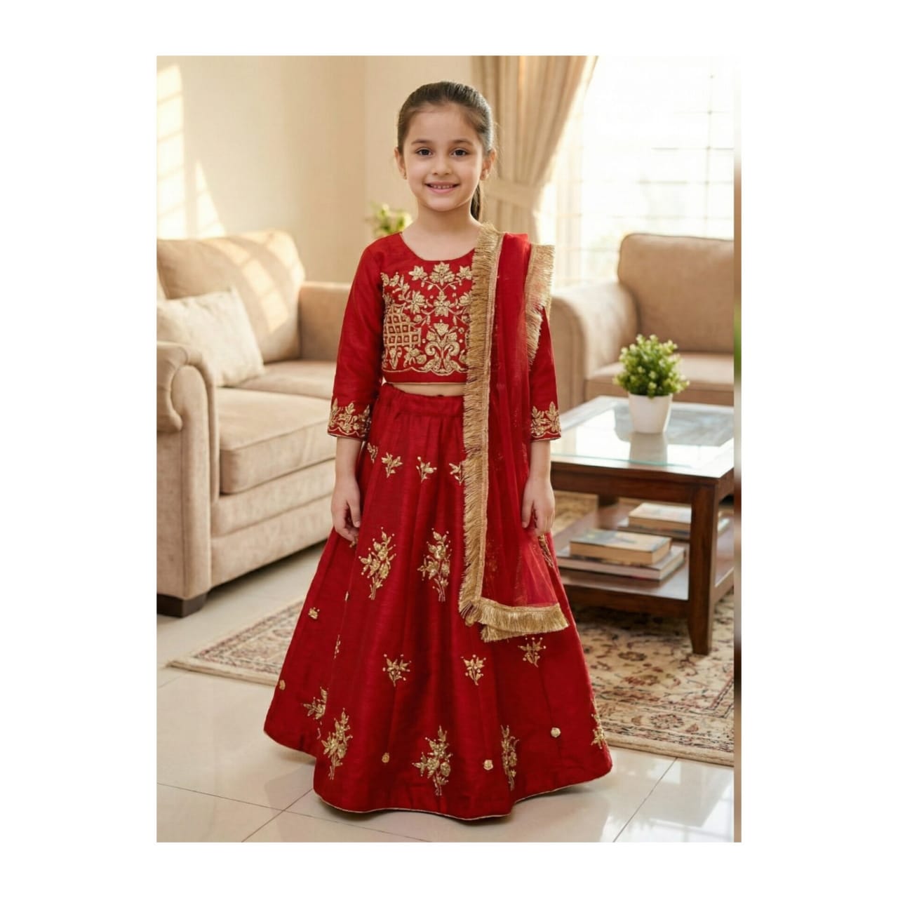 The delicate embroidery adds a touch of elegance and sophistication, creating a truly eye-catching design. Our Blood Red Lehenga Choli is designed to make your child feel confident and stylish. The outfit is perfect for special occasions, and the embroidery adds a touch of glamour.