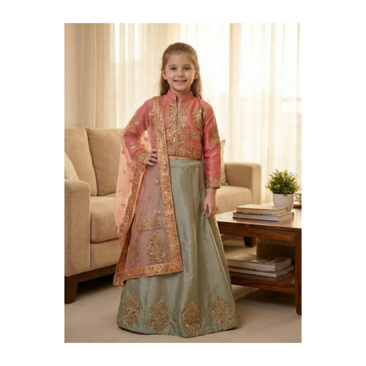 The mint green maxi features intricate embroidery and embellishments, adding a touch of luxury and sophistication. The tea pink jacket provides a pop of color and complements the mint green perfectly. The outfit is perfect for kids who want to look and feel their best on special occasions.