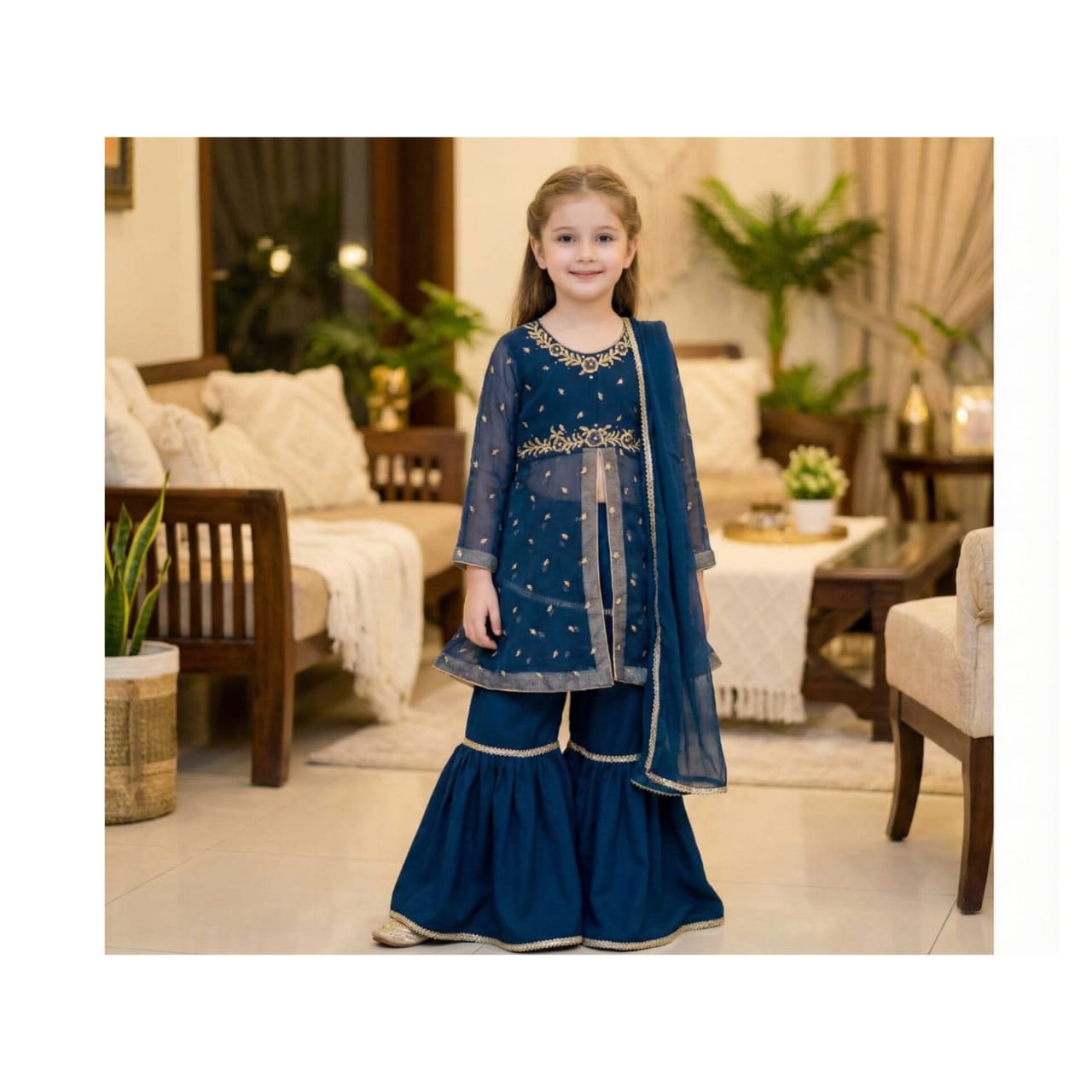 Dina Teal Blue Gown for Kids is a stunning traditional outfit designed for kids. The long, flowing dress is made of luxurious fabric and features intricate gharara work along the hem, sleeves, and neckline. The Teal Blue Gown for Kids with gharara pattern is intricately designed with delicate thread work, adding a touch of elegance to the overall design. The gown has a comfortable fit and is perfect for special occasions like weddings, festivals, or cultural events. The teal blue color is a beautiful shade that complements most skin tones, and the gharara work adds a traditional touch. The gown is suitable for kids aged 4-12 and comes in various sizes