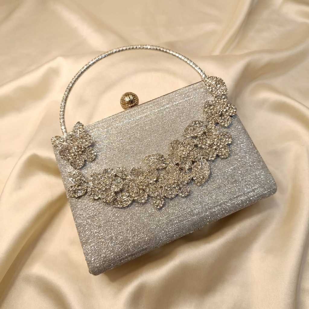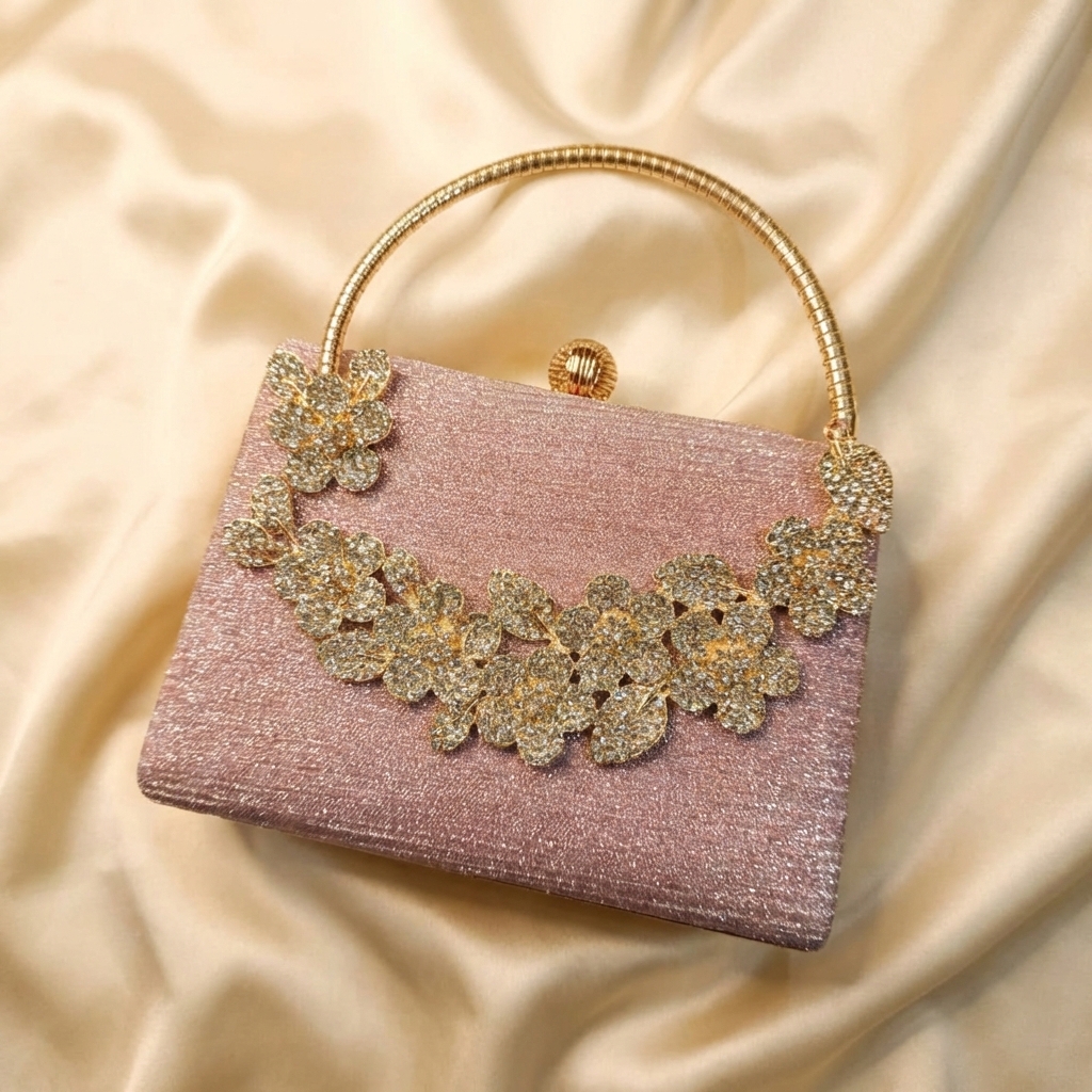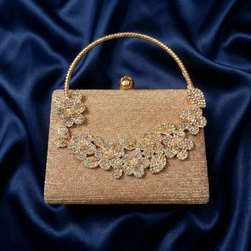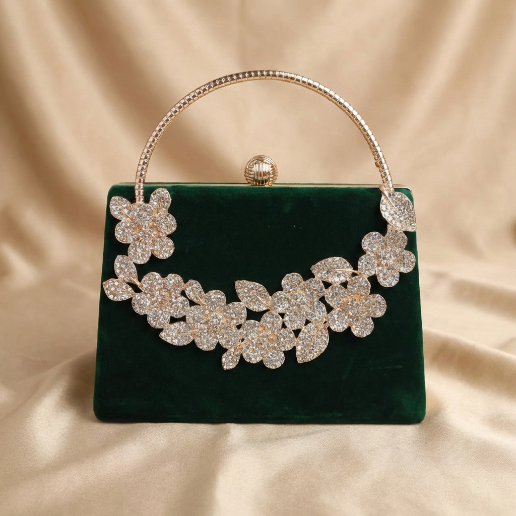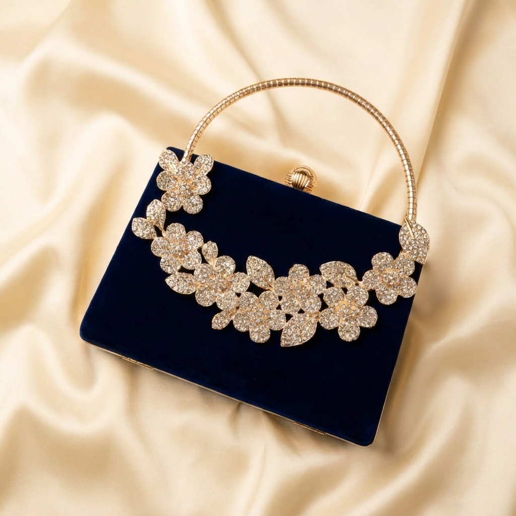 Elevate your evening look with the Elara Floral Embellished Clutch a statement luxury handbag designed for weddings, parties, and festive occasions. Crafted with a rich velvet finish and adorned with shimmering floral crystal embellishments, this clutch features an elegant gold-tone handle that adds timeless charm.