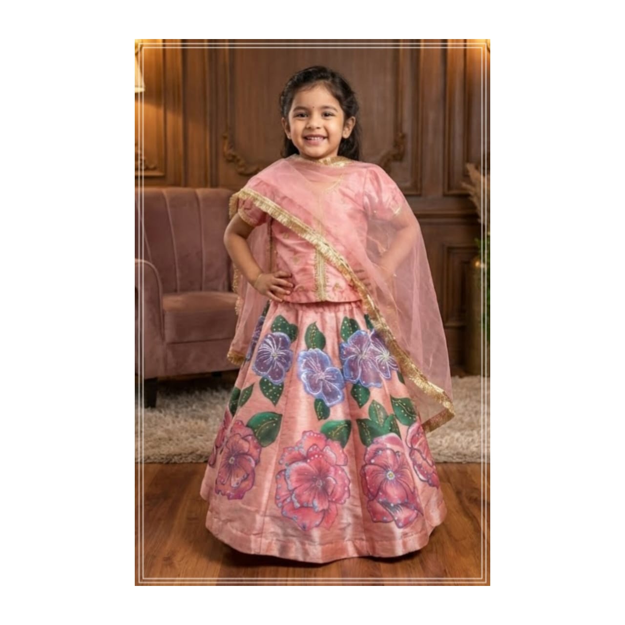 Dress your little one in elegance with our Inaya hand-painted lehenga, paired with an embroidered blouse and gota embellished dupatta. Perfect for weddings, festivals, and special occasions