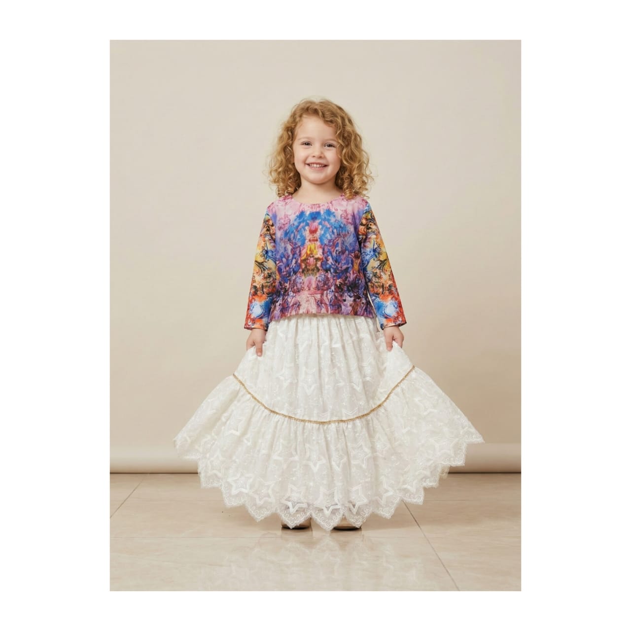 Lara Kids Outfit, featuring a silk floral print top paired with a beautifully embroidered cotton skirt. A perfect choice for festive occasions and celebrations.