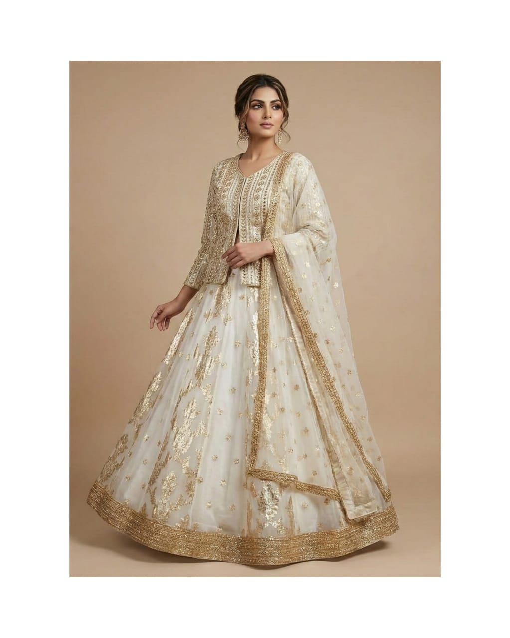 Elegance personified! Mahira features a stunning chikan kari chiffon choli paired with a rich kundan zari lehenga. Perfect for weddings, sangeet, or mehndi events.