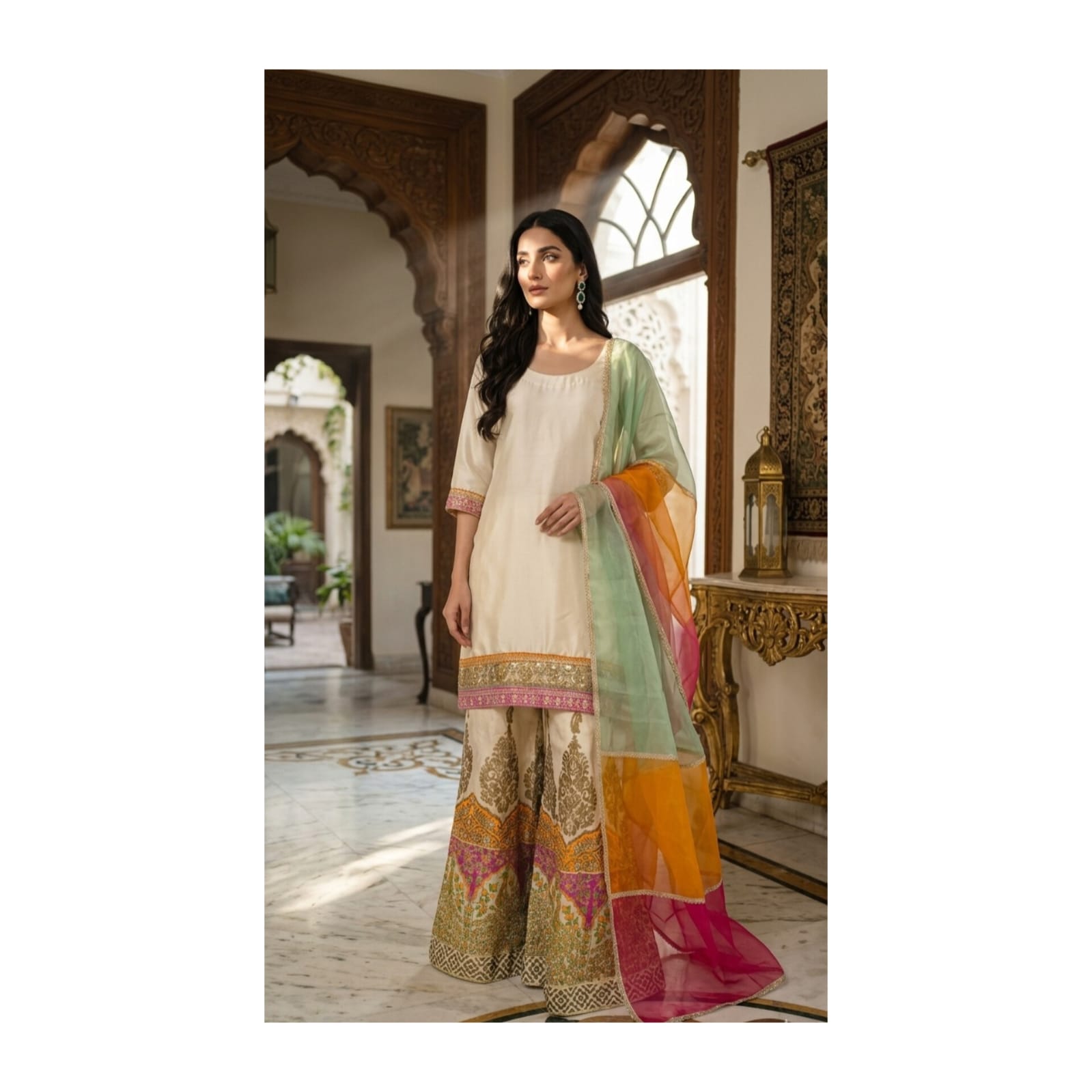 Paired with a light-as-air organza dupatta, Mehar un Nisa is the epitome of high-end fashion. Whether it’s a festive celebration or a formal evening, this silk masterpiece ensures you stand out with effortless poise.