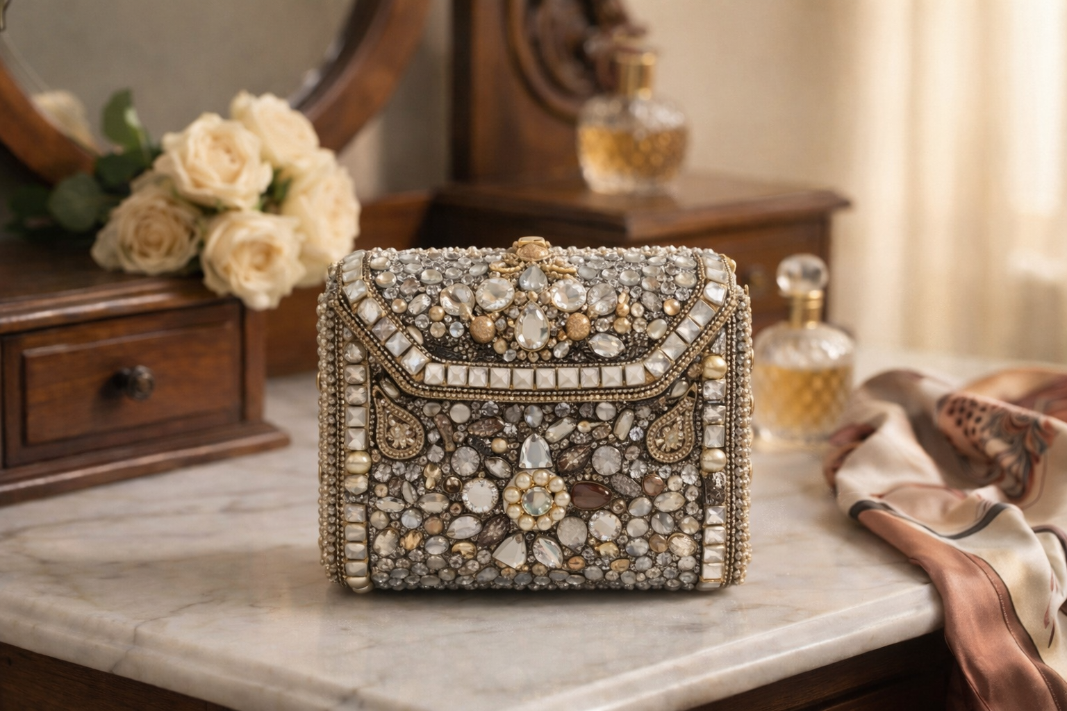 Mehreen Luxe Luxury handcrafted metal clutches with kundan, pearls & stone work. Perfect for bridal, wedding & festive wear. Shop premium evening clutches online.