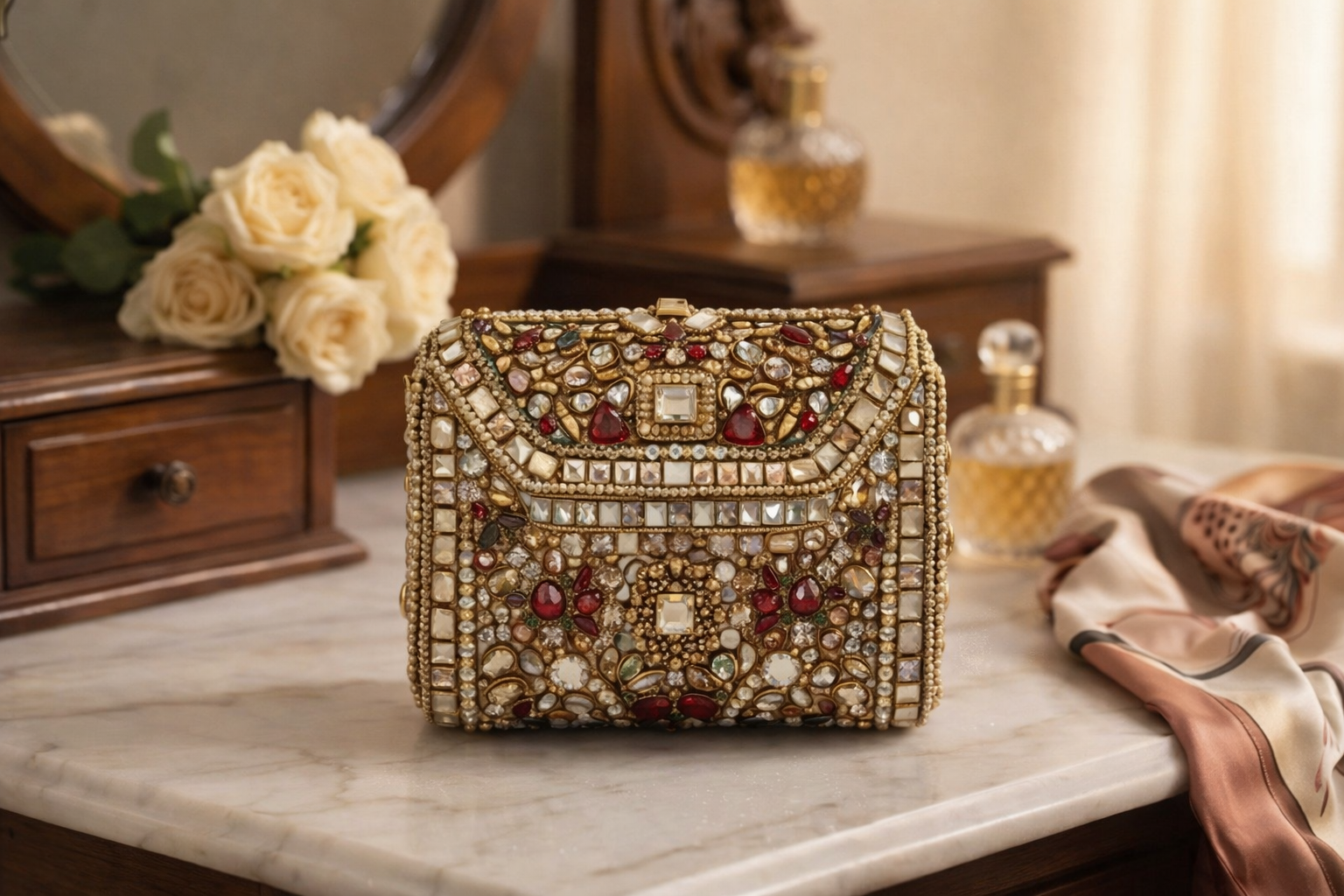 Nooré Kundan Luxury handcrafted metal clutches with kundan, pearls & stone work. Perfect for bridal, wedding & festive wear. Shop premium evening clutches online.