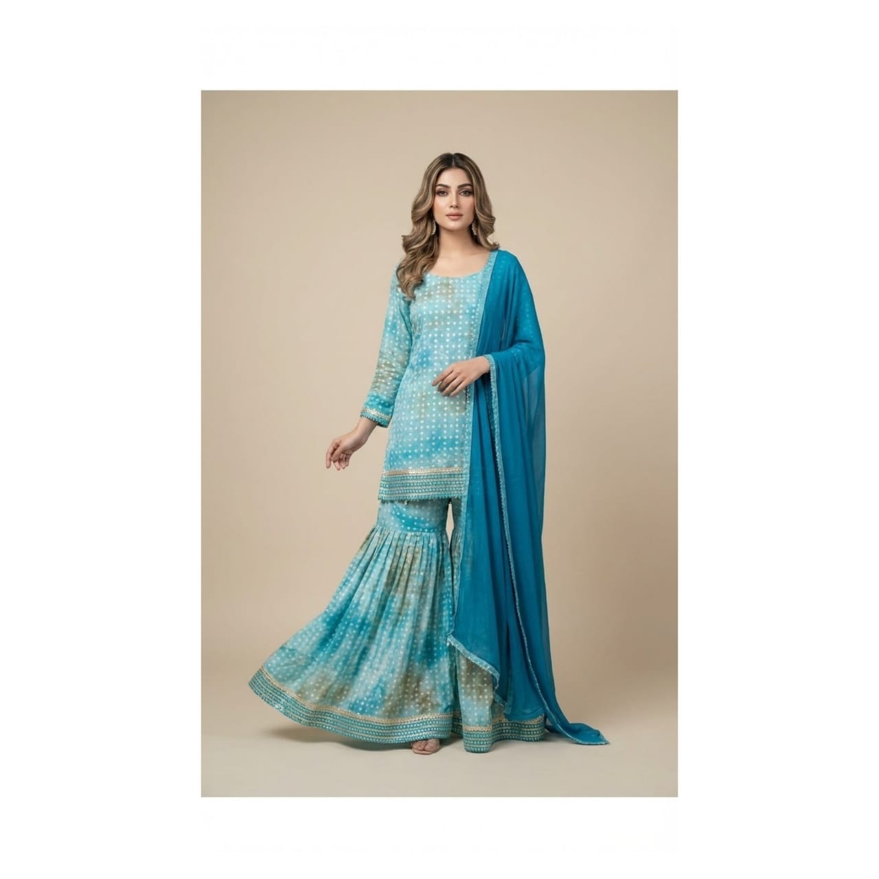 Elevate your ethnic look with Noran stunning blue gharara suit, featuring intricate foil work. Perfect for weddings, parties, and special occasions.