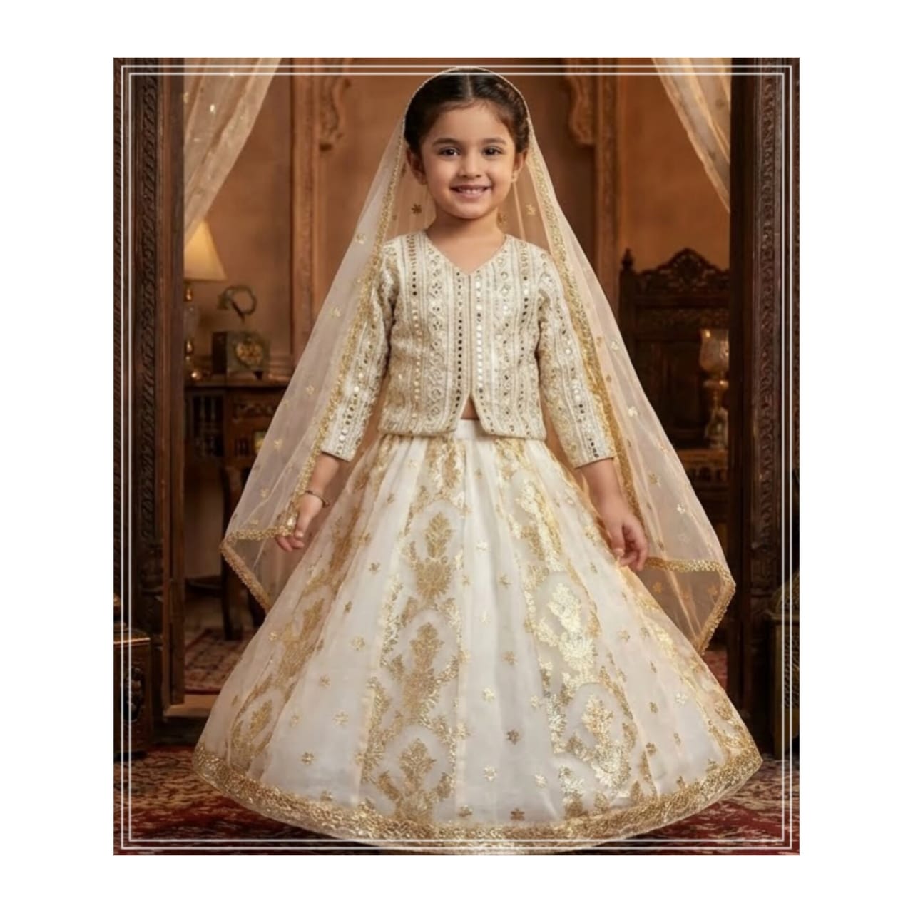 We design our outfit for kids who want to make a statement at special occasions. With its unique blend of traditional craftsmanship and modern style, our outfit turns heads. Choose our White Chikankari Choli with Fancy Lehenga and make your child’s special occasion unforgettable.