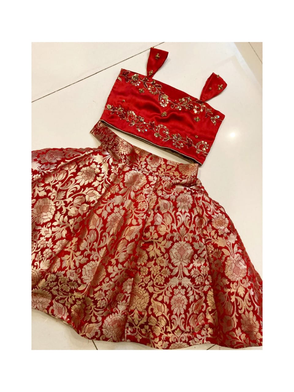 Dress your little one in regal elegance with our red fully handwork choli paired with a luxurious Banarsi lehenga. Perfect for weddings, festivals, and special occasion.
