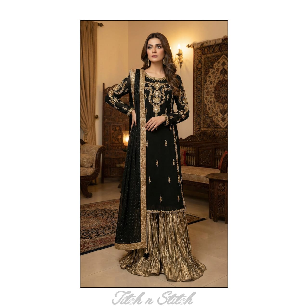 Elevate your style with this stunning Rija Copper Embellished Outfit. This stunning black chiffon long shirt, paired with crushed tissue palazzo in copper and a luxurious banarsi chiffon dupatta. Perfect for formal events, weddings, and special occasions, this outfit exudes elegance and sophistication.