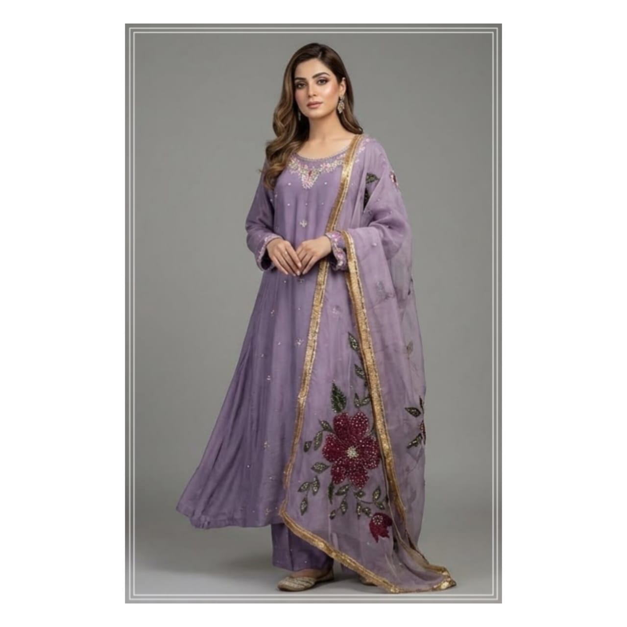 The hand-painted organza dupatta adds a touch of elegance and whimsy. The Pakistani raw silk suit provides a luxurious and comfortable fit. With intricate hand embellishments adorning the suit.
