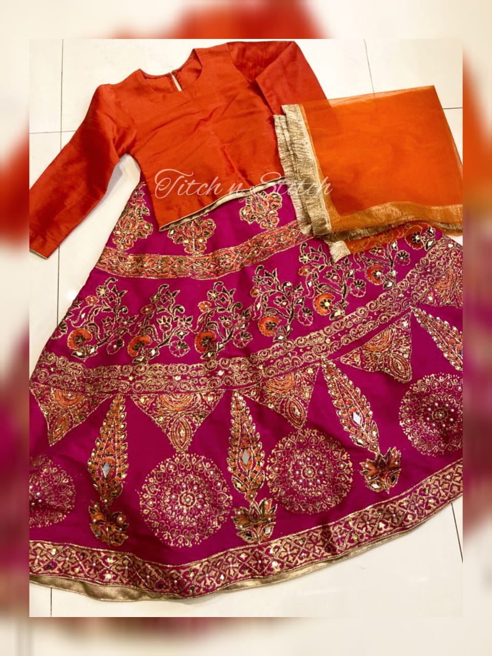 The vibrant colors and intricate details create a truly eye-catching design. Our Shocking Pink Lehanga with Orange Choli is a perfect choice for kids who want to look and feel their best. The combination of shocking pink and orange is a bold and playful choice, sure to turn heads at any event.