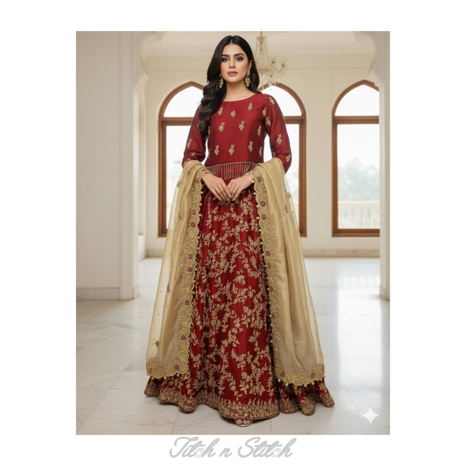 The crimson red color is a stunning choice, evoking feelings of passion, energy, and strength. It’s a color that demands attention, and with the heavy embroidery and sequins, this outfit is sure to turn heads. The gold zardozi work adds a touch of glamour and shine, making you feel like a royal bride as you walk down the aisle.