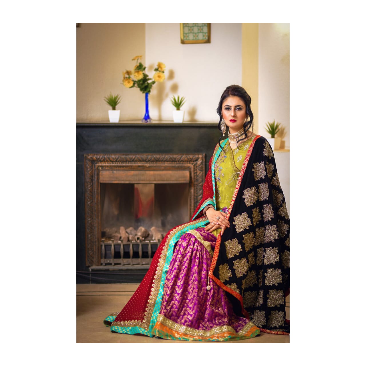 The Zarnab Magenta Gharara with Lime Green Shirt and Maroon Dupatta is a stunning outfit that exudes Royal Look with elegance. The magenta gharara is a beautiful, flowing garment with intricate embroidery and detailing, paired with a vibrant lime green shirt that adds a pop of color to the overall look. The maroon dupatta adds a touch of sophistication and completes the outfit.